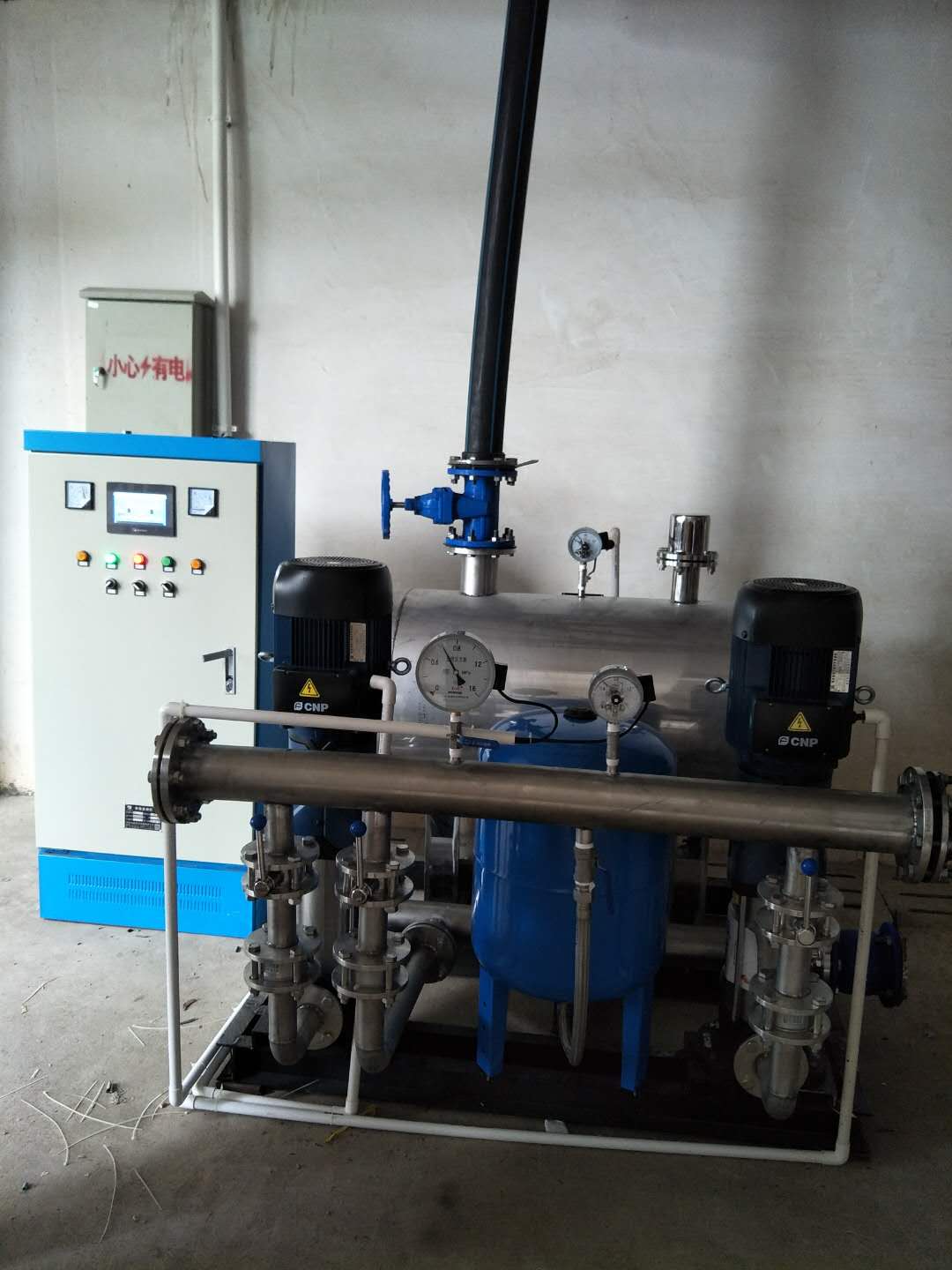 2018.5.14和平縣興平水電開發有限公司第三次與我司合作,簽訂供水設備購銷合同,用于小區生活供水,次項目有設計院提供設計圖紙,我司技術員根據現場情況及多年技術檢驗設計一套無負壓變頻供水設備,型號ZYW50-50-5.5-2,配兩臺5.5kw不銹鋼加壓泵,一用一備